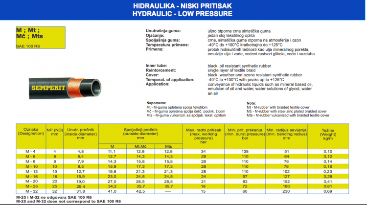 Reintorcement:single layer of textile braid, Cover:black, weather and ozone resistant synthetic rubber, Temperat. of application:-40°C to +100°C with peaks up to +125°C, Application:conveyance of hidraulic liquids such as mineral based oil, emulsion of oil and water, water solutions of glycol, water an airHYDRAULIC - LOW PRESSUR
