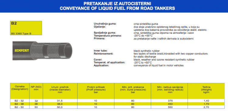 Inner tube: black synthetic rubberReintorcement: two layers of textile braid,inbraided with two copper conductors for static dischargeCover: black, weather and ozone resistant synthetic rubberTemperat. of application: -25°C to +50°CApplication:conveyance of liquid fuel in motor vehicles
