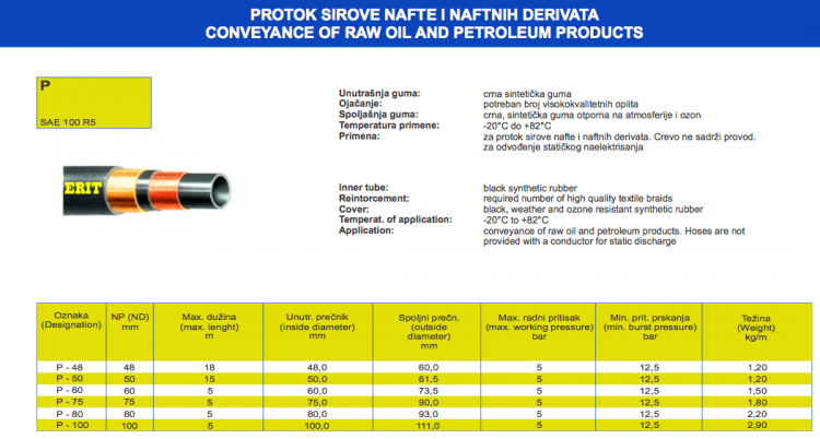 Reintorcement: two layers of textile braid,inbraided with two copper conductors for static dischargeCover: black, weather and ozone resistant synthetic rubber, Temperat. of application: -25°C to +50°CApplication:conveyance of liquid fuel in motor vehiclesCONVEYANCE OF RAW OIL AND PETROLEUM PRODUCTS