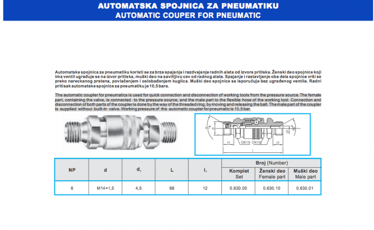 The male part of the coupler is supplied without built-in valve.Workingpressureof the automaticcouplerforpneumaticis10,5bar.
