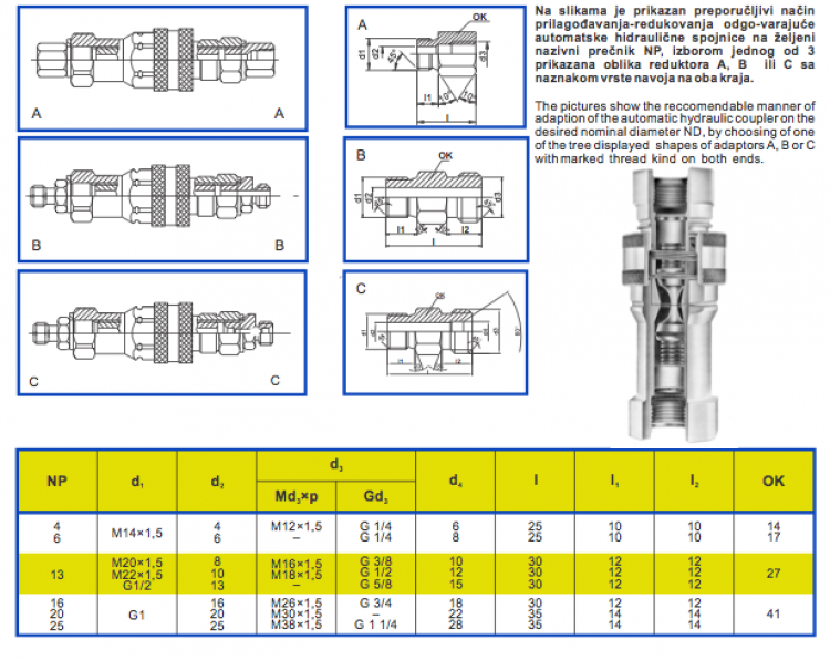 Na slikama je prikazan preporuÄljivi naÄin prilagoÄ‘avanja-redukovanja odgo-varajuće automatske hidrauliÄne spojnice na željeni nazivni preÄnik NP, izborom jednog od 3 prikazana oblika reduktora A, B ili C sa naznakom vrste navoja na oba kraja.